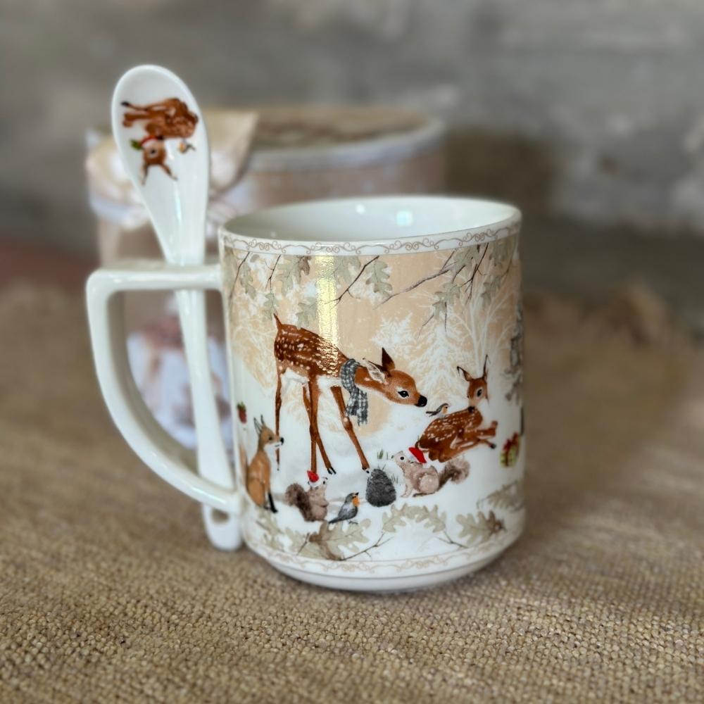 Caja diseño navidad, cilíndrica (diámetro 12, altura 10) con una taza diseño navideño, incluye cucharita de cerámica