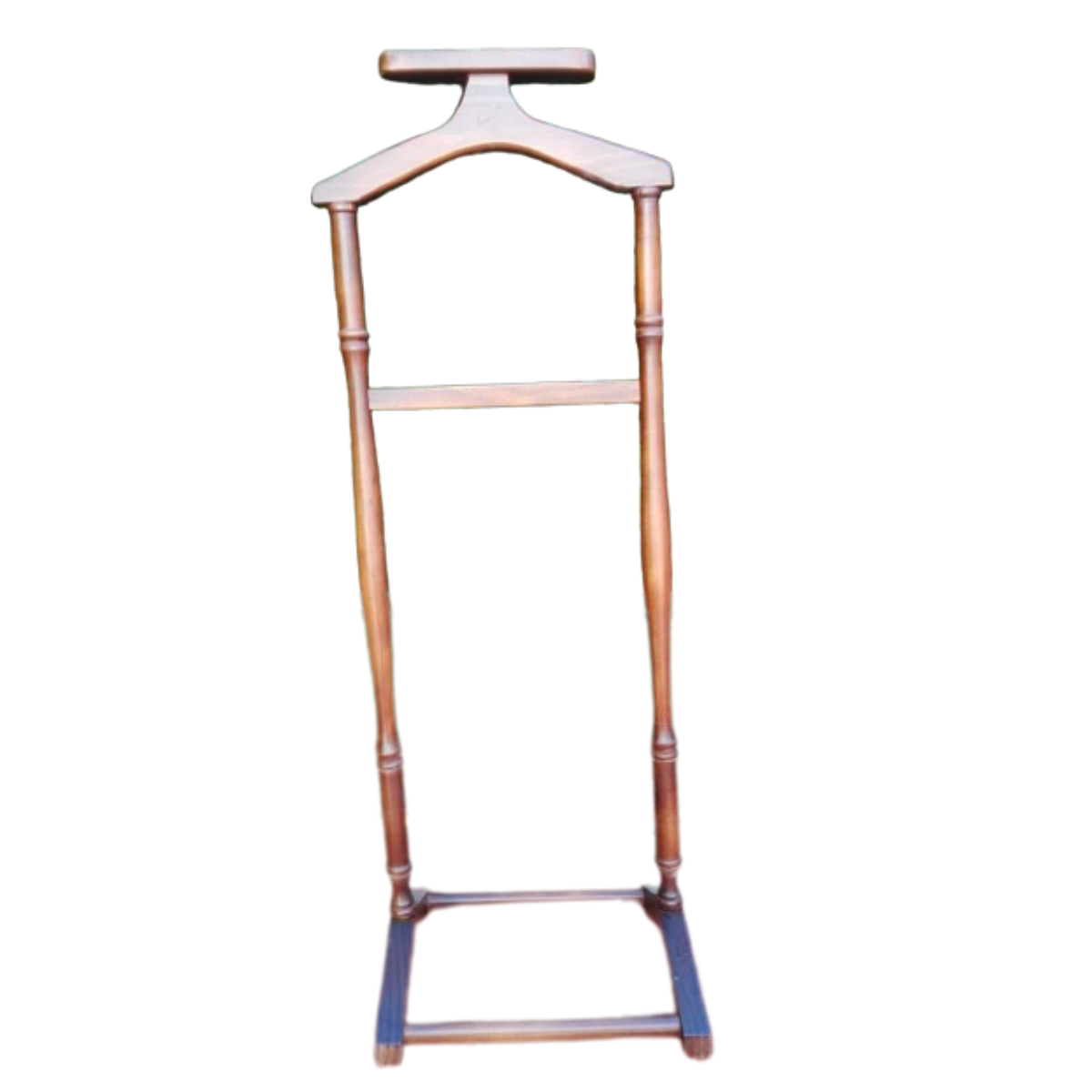 Galán Uno, despojador de ropa de diseño clásico y bien simple, estructura de madera, base de 41cmx43cm y 124 cm de altura a la percha. Parantes con detalles torneados, percha recta para pantalones y percha final para camisas.